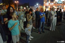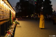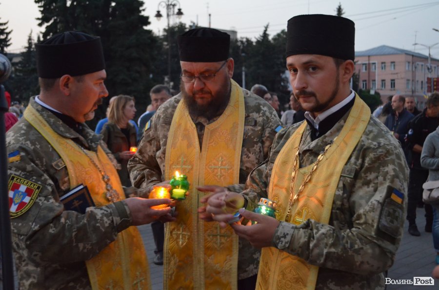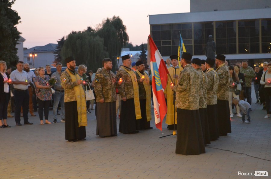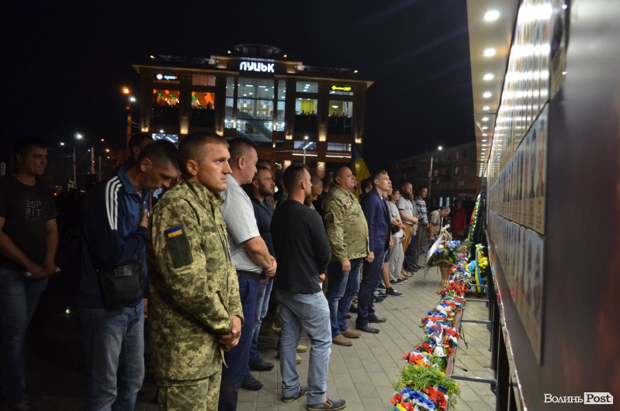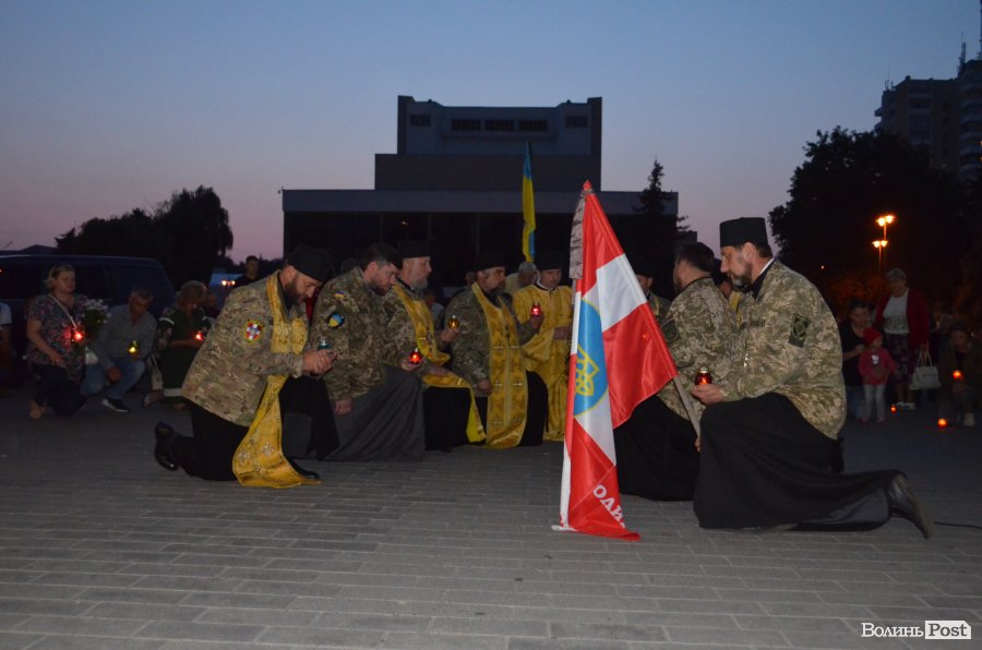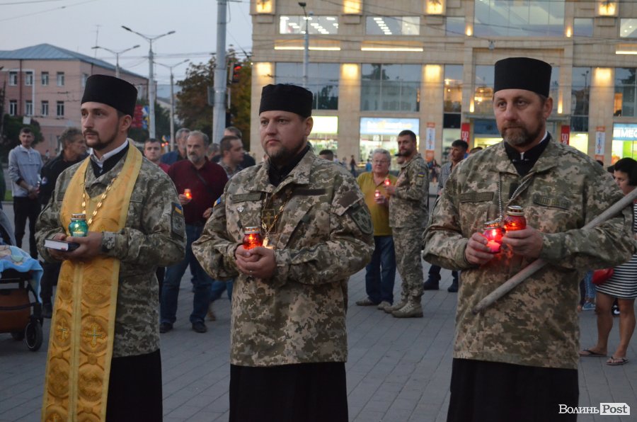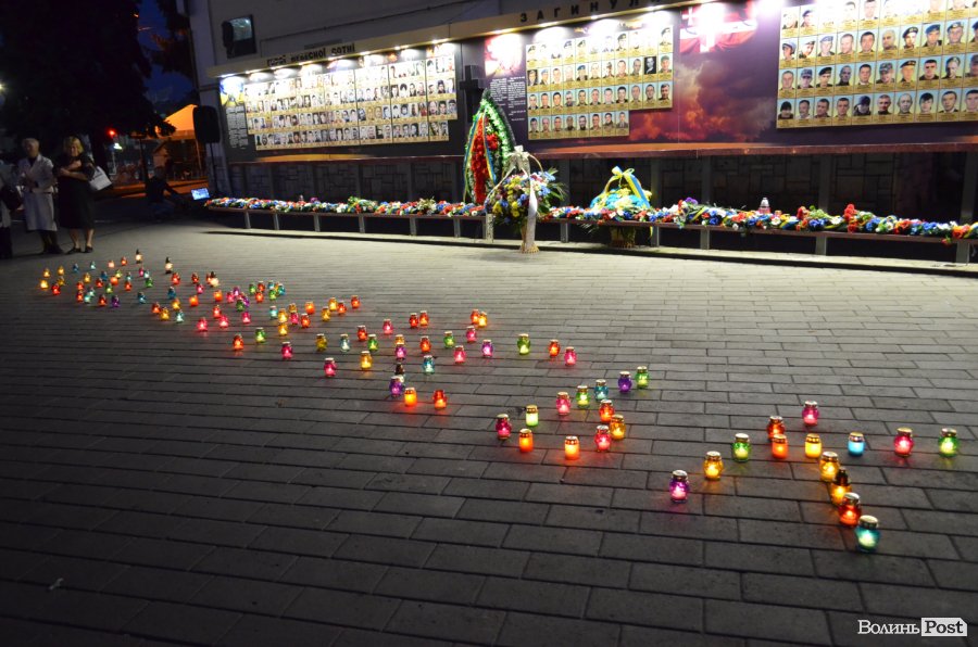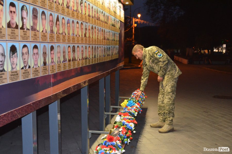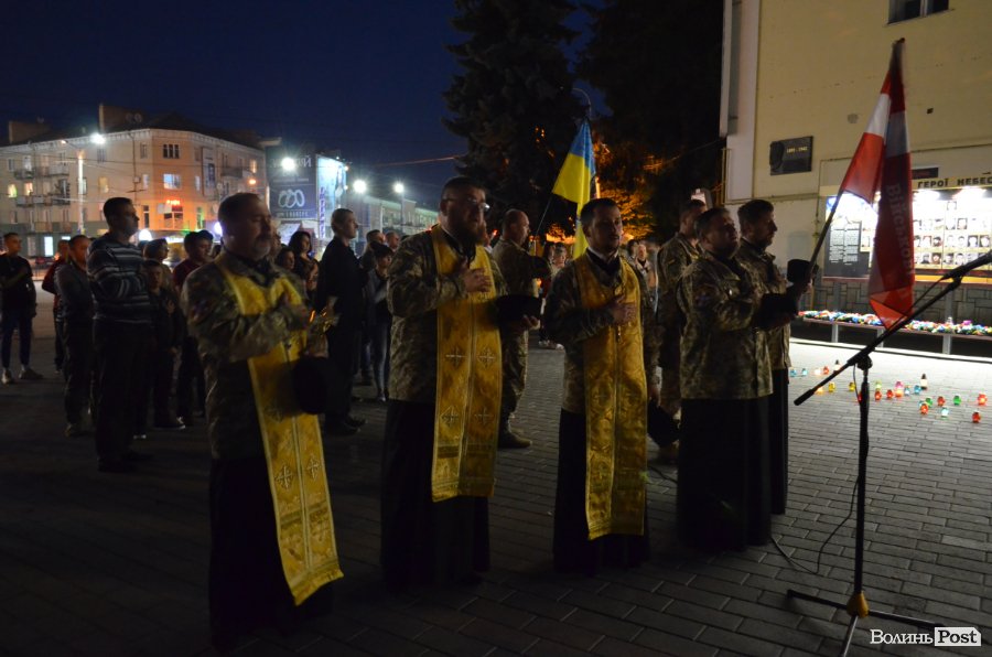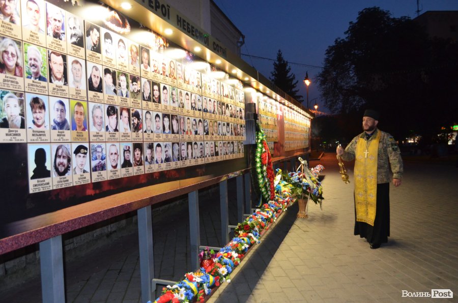 На четверту річницю Іловайської трагедії, у народний День пам'яті загиблих за свободу України, біля фотостенду у центрі Луцька міста забралися військові капелани та майже сотня лучан.