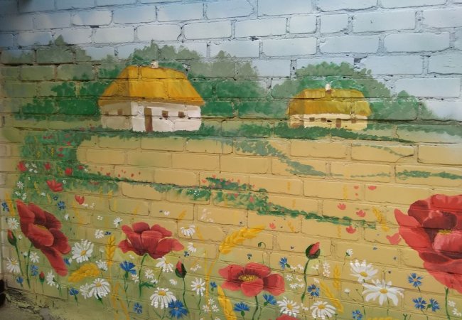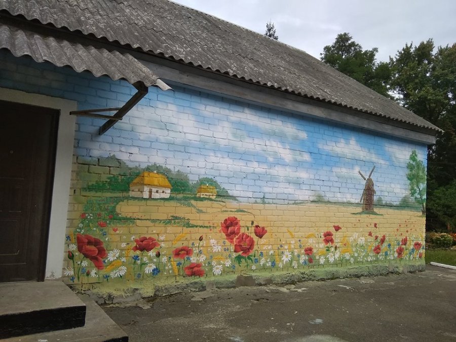 Стіну школ прикрасили яскравим барвами, заквітчали соняшниками та маками, а також красивим українським пейзажем із хатою під очеретяною стріхою та пшеничним полем.