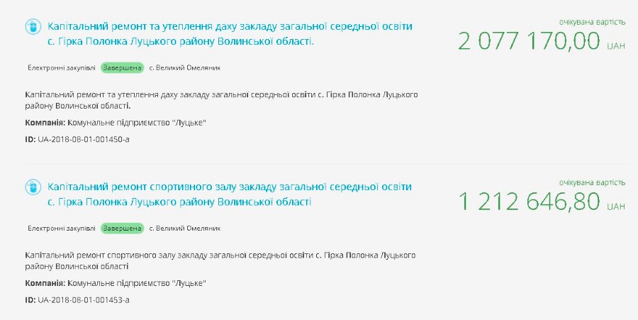 Наприкінці 2017 року КП «Луцьке» уклало договори на ремонти загальноосвітніх закладів у селах Воютин, Боратин та Гірка Полонка, а також договір на виготовлення проектно-кошторисної документації на капітальний ремонт школи у селі Гірка Полонка із тією ж фірмою «Будівельна компанія «Терон девелопмент». Вартість укладених договорів сягнула 4 074 149 гривень, тож із підрядником розпочали розрахунок вже наступного дня після укладення першого договору.