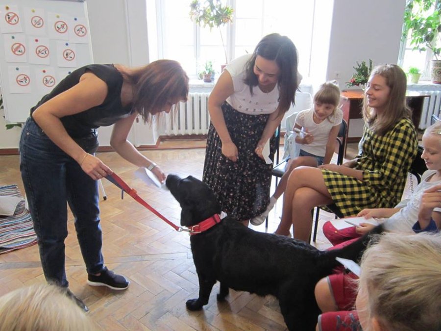 Нова група школярів разом із батьками знайомились із правилами поведінки із собакою, а спеціальні учасники проекту чотирилапі волонтери: лабрадори Лампа, Альма та лайка Джесі допомагали їм у цьому.