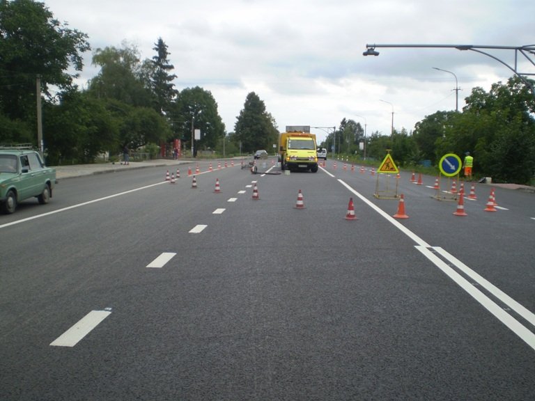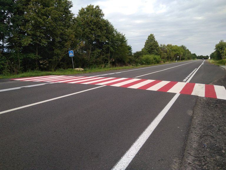 Під час проведення робіт осьову розмітку та пішохідні переходи виконали за допомогою довговічного матеріалу – холодного пластику, крайову – розміточною фарбою.