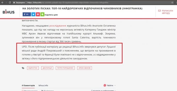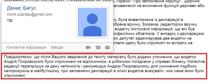 "Журналістам надіслали лист із проханням виправити некоректну інформацію та вказати, що я їздив за кордон у справах, а не відпочивати. Дякую редакції bihus.info, яка оперативно надіслала відповідь, внесла роз'яснення у матеріал, а також вибачилася за вказані неточності у статті. Приємно, що журналісти визнають свої помилки!", - зауважив Андрій Покровський на сторінці у Facebook.