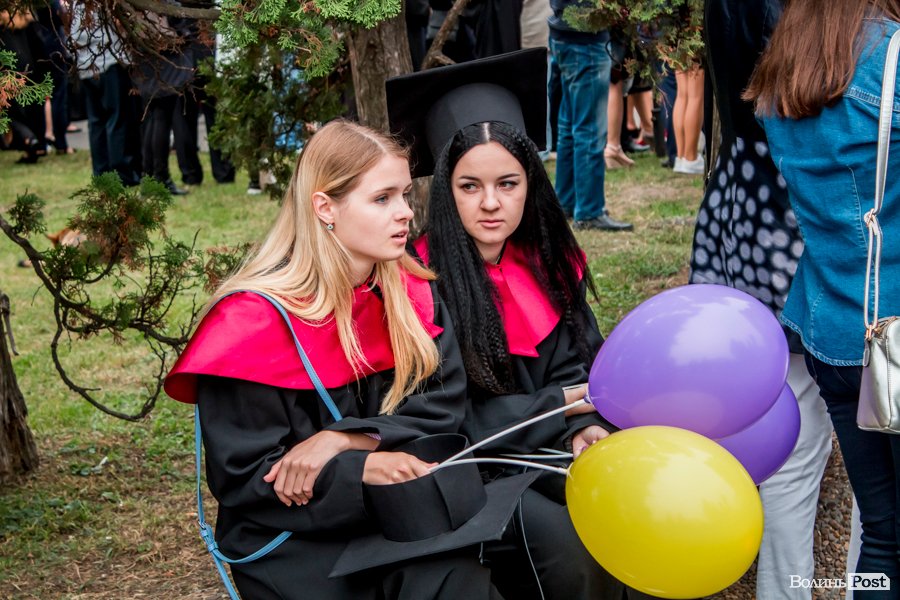 Студенти тримали у руках сині та жовті кульки, а також букети для викладачів. Збоку чималою шеренгою розташувалися батьки, які раз-у-раз знімкували дітей та крадькома змахували з очей сльози.