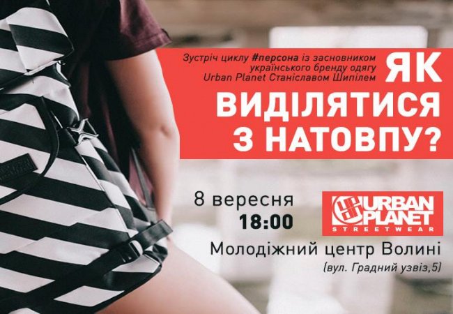 У суботу, 8 вересня, о 18:00 у приміщенні Молодіжного центру Волині (вул. Градний Узвіз, 5) у відбудеться зустріч із власником і засновником популярного бренду одягу «Urban Planet» Станіславом Шипілем. Захід відбудеться у рамках серії подій «Персона».