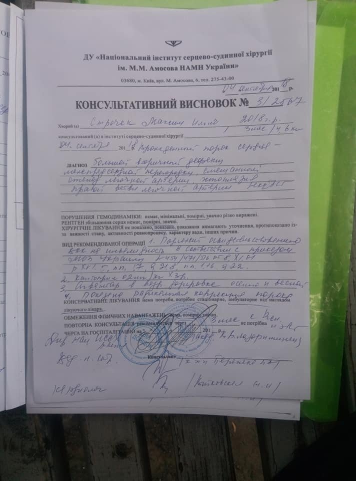 Наразі немовляті проведено перший етап обстеження у Національному інституті серцево-судинної хірургії ім. М. М. Амосова, де підтверджено виявлення пороків, призначено лікування та подальше обстеження.