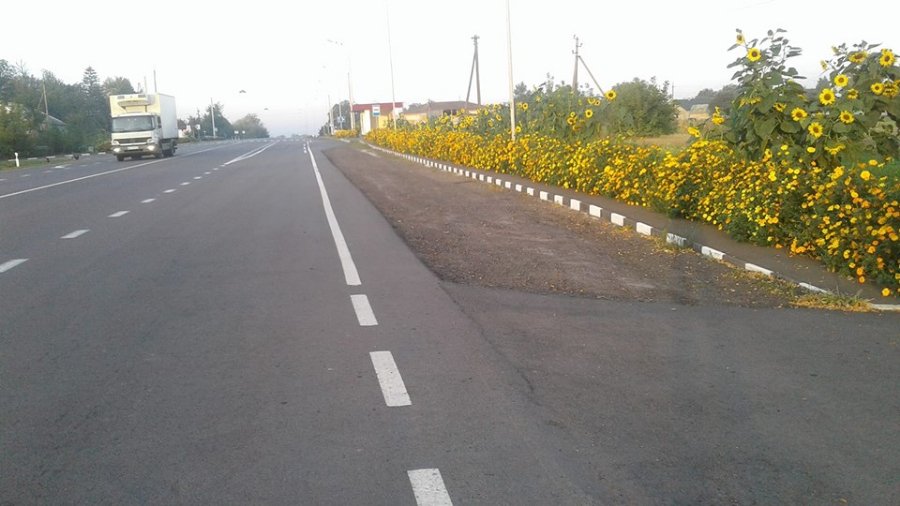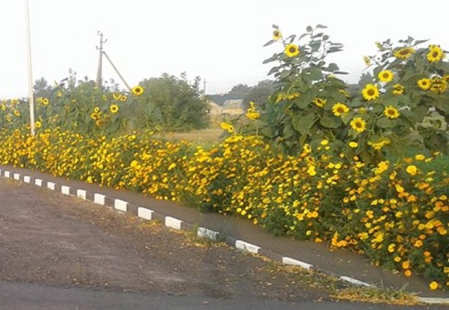 селі Чаруків неподалік обласного центру вздовж траси розквітли чорнобривці та соняхи.