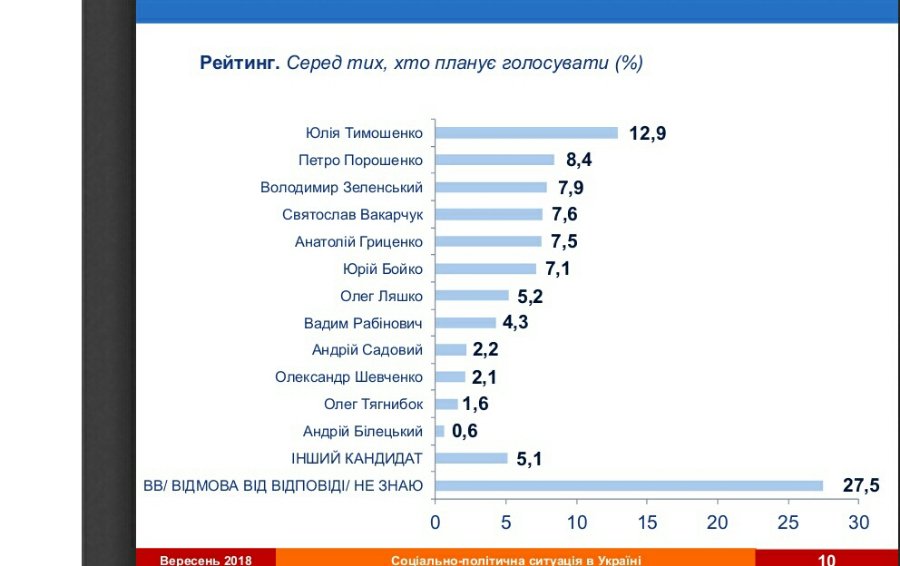Серед усіх опитаних Тимошенко має 11,0% підтримки, Порошенко – 7,1%, Зеленський – 6,7%, Вакарчук – 6,5%, Гриценко – 6,3%, Бойко – 6,0%, Ляшко – 4,4%, Рабінович – 3,6%.