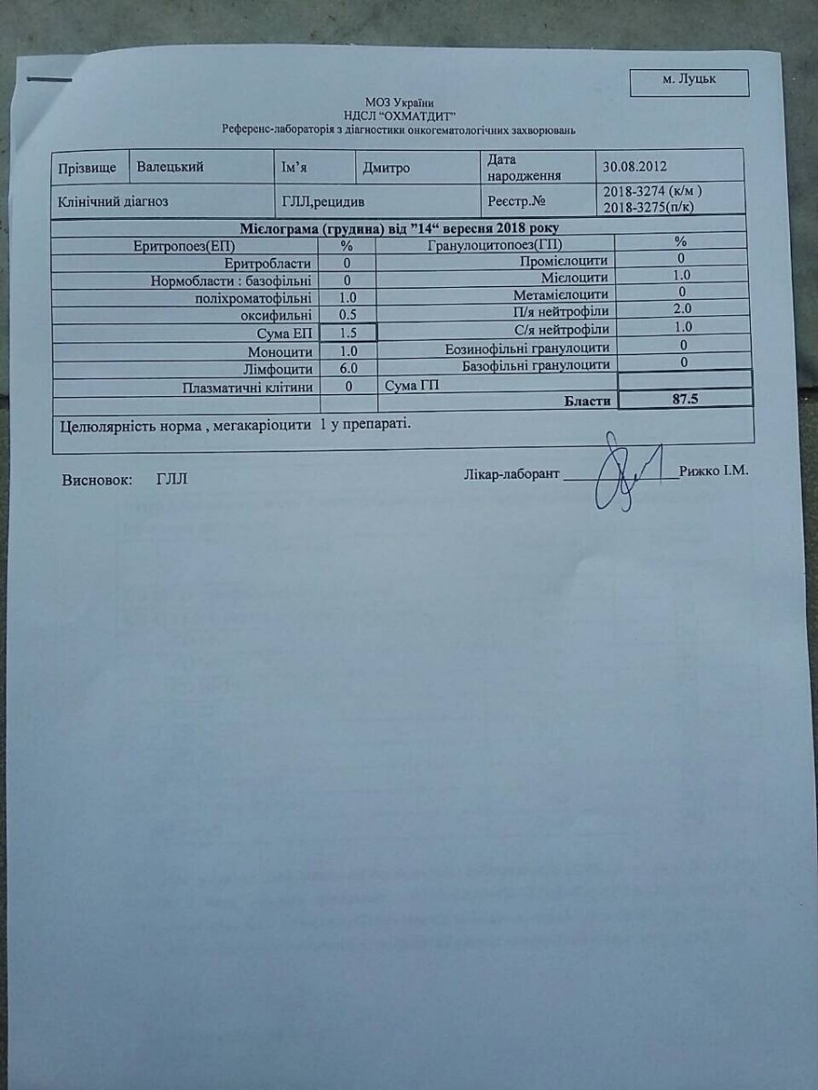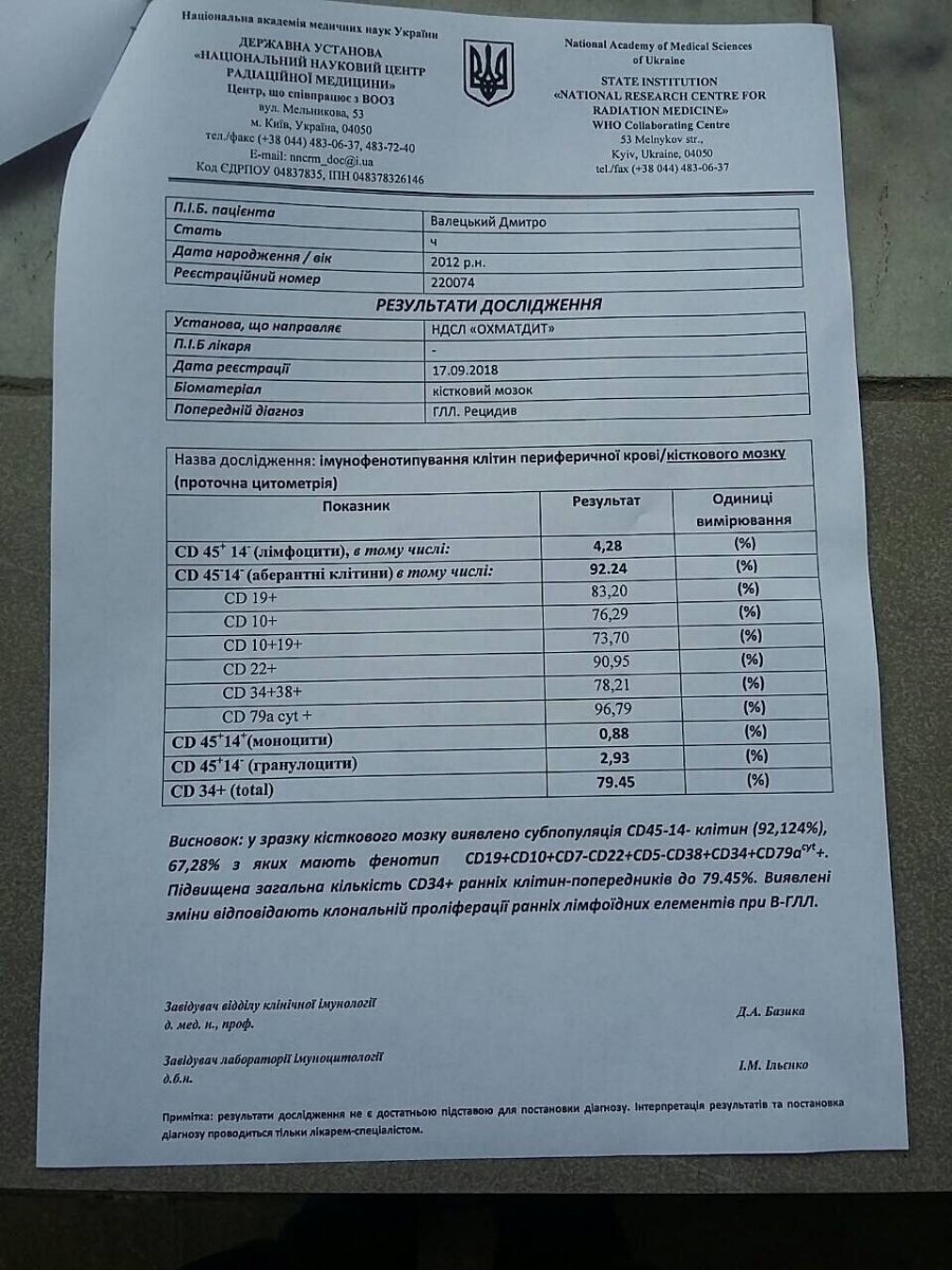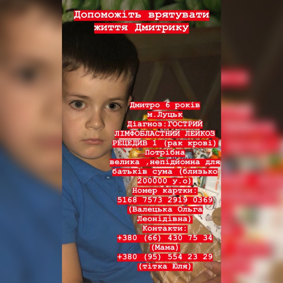 "Сьогодні вночі Діма з мамою виїхали в Білорусію, де буде проходити курс хіміотерапію ціною 20000$ ,наступний курс 60000$,пересадка кісткового мозку 180000$", - йдеться у дописі.