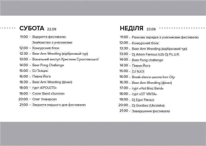 Окрім того, організатори подбали і про цікаве дозвілля. На відвідувачів чекають конкурси, розіграші, виступи гуртів та дискотека. Гості вправлятимуться у бір-понгу, пивній йозі, брейк-дансі. А музичний настрій їм даруватимуть відомі гірти - Epolets, OtVinta та інші.