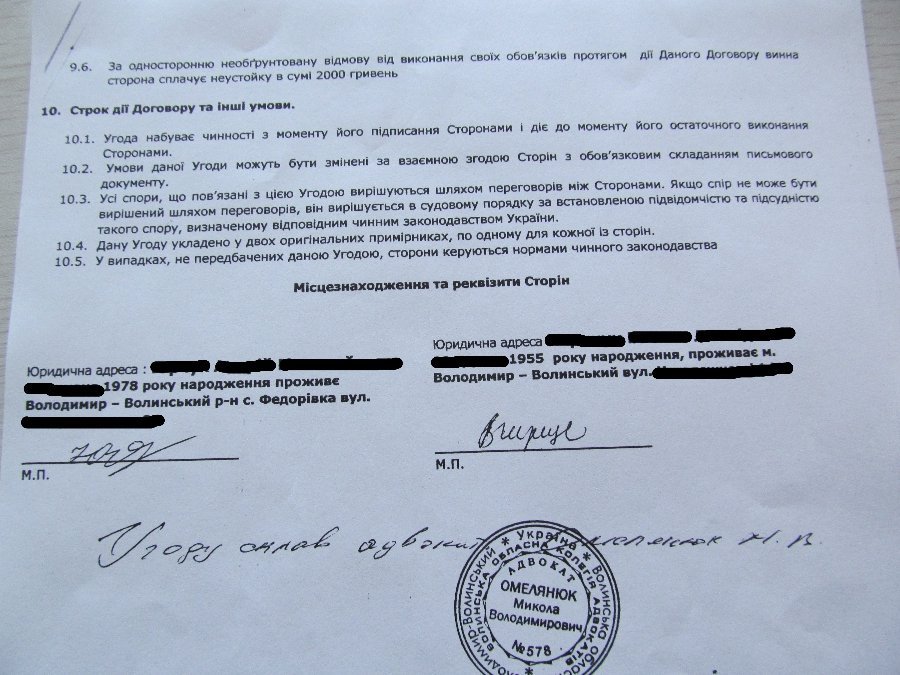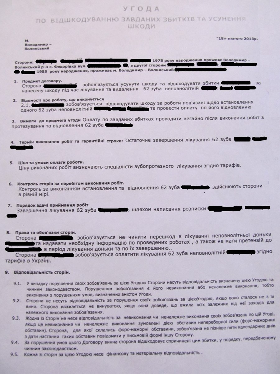 Чекати на результат довго не довелося. Стоматолог запропонував батькові потерпілої укласти угоду про відшкодування завданих збитків та усуненню шкоди. В ній йдеться, що всі витрати по протезуванню та відновленню зуба бере на себе лікар, а у випадку невиконання зобов’язання буде змушений виплатити «неустойку» обсягом дві тисячі гривень.