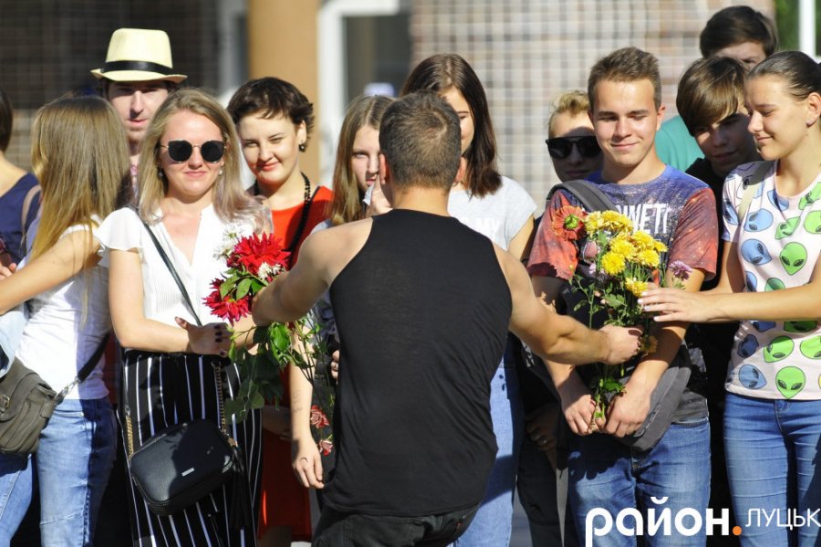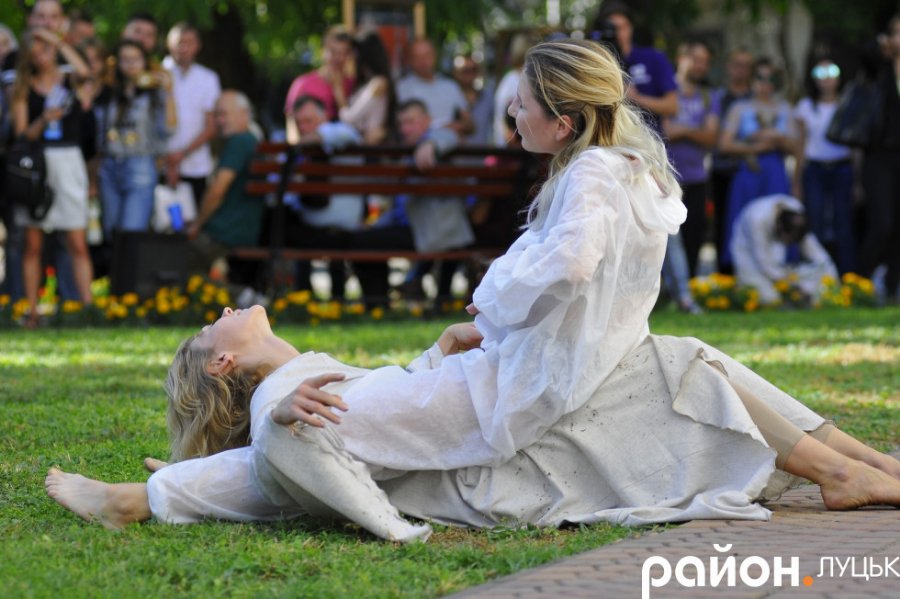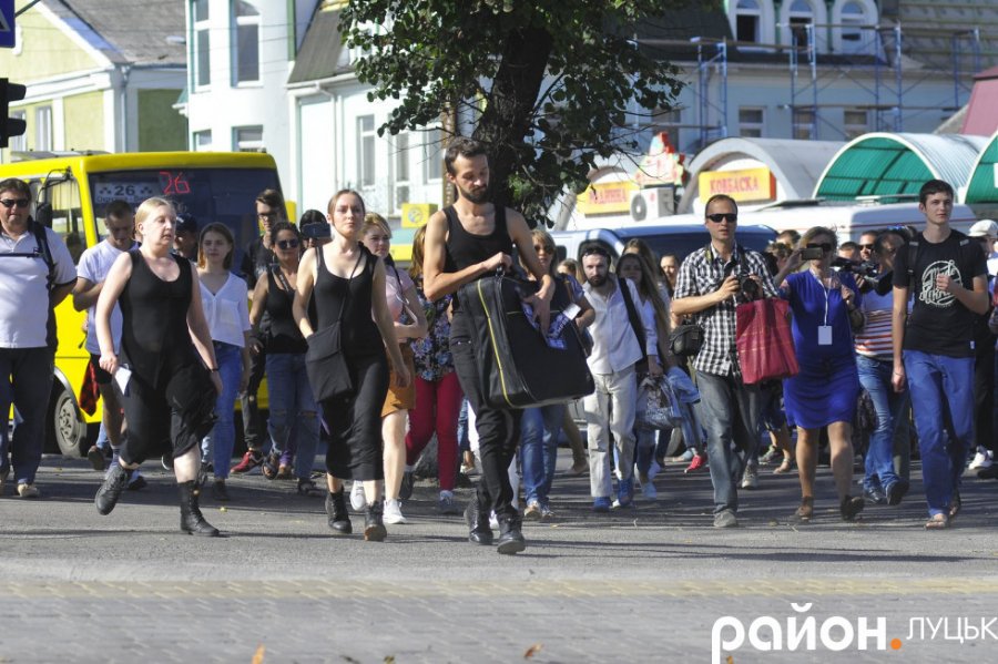 Перед тим у натовп вийшли двоє молодиків спортивної статури із велетенською колонкою. Вони увімкнули музику, і театр почався.