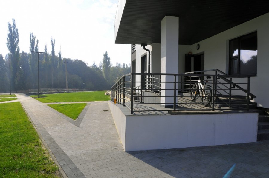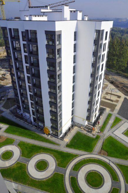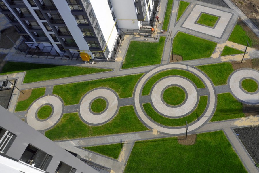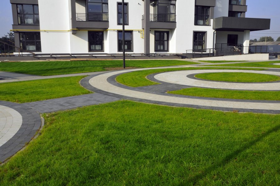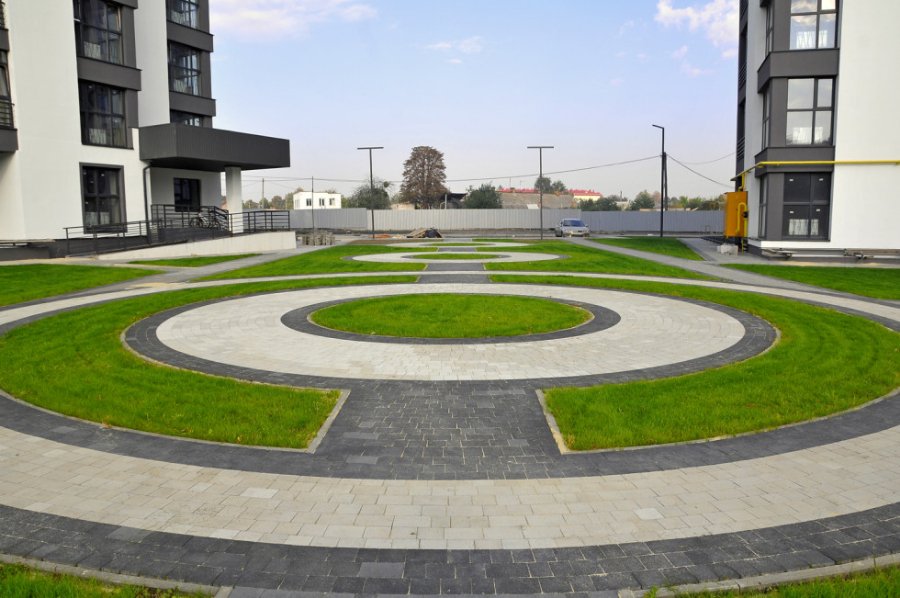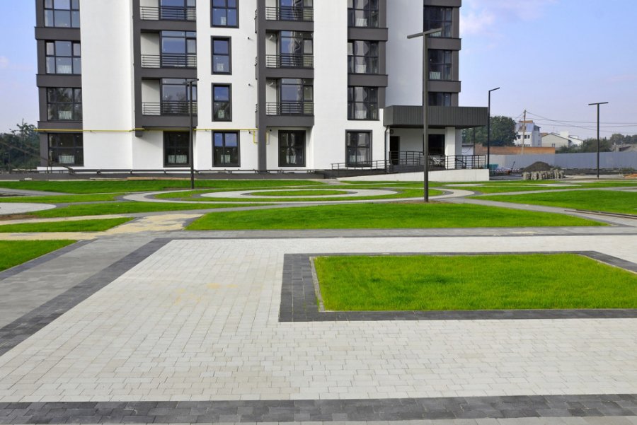 Також біля перших трьох будинків житлового комплексу облаштовують територію: виклали пішохідні доріжки бруківкою, з боків якої зеленіє акуратна трава.