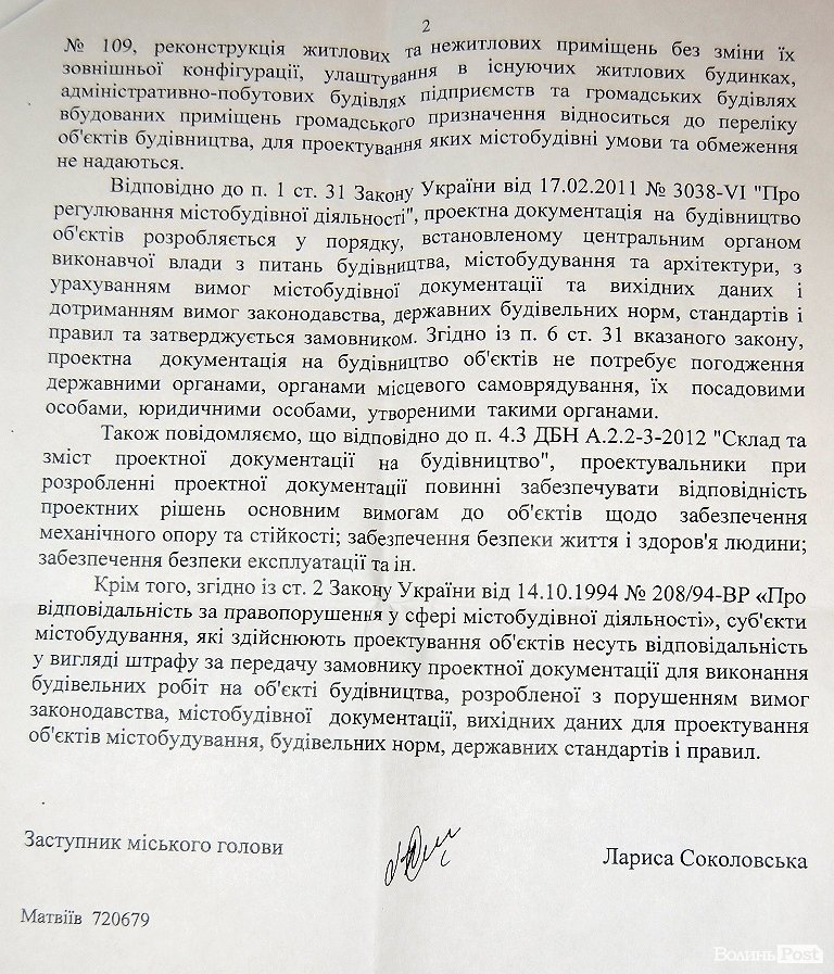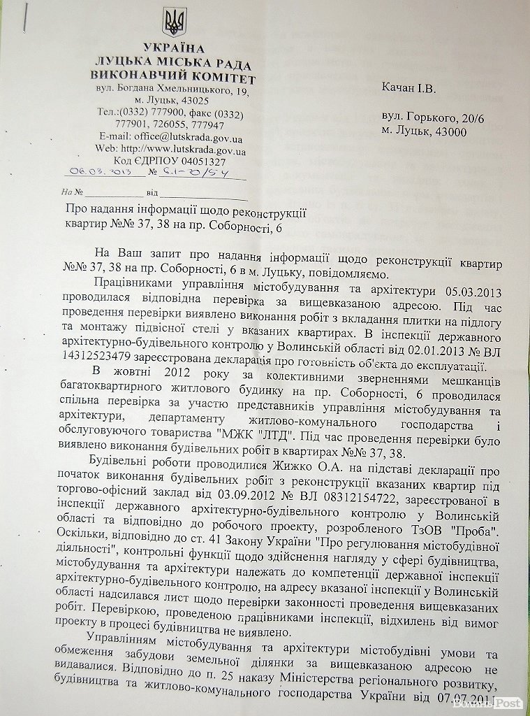 З мерії надійшла відповідь, підписана заступником міського голови Ларисою Соколовською. У відповіді йдеться: нещодавно, а саме 5 березня працівники управління архітектури та містобудування провели перевірку цього будівництва. «Під час проведення перевірки виявлено виконання робіт з вкладання плитки на підлогу та монтажу підвісної селі у вказаних квартирах. В Інспекції державного архітектурно-будівельного контролю у Волинській області від 2 січня 2013 року зареєстрована декларація про готовність об’єкта до експлуатації» - заспокоїла Лариса Соколовська.