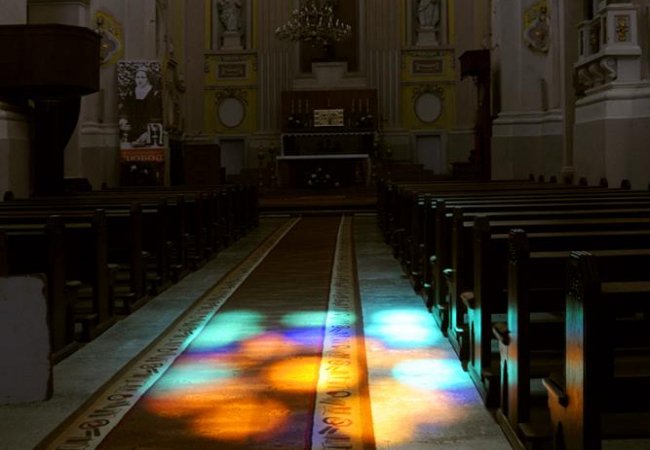 «Перед 12-ю, у інтер'єрі костелу, при сонячній погоді, можна спостерігати чудову, різноколірну світлову квітку, яку утворюють промені сонця, що падають через вітраж під куполом.