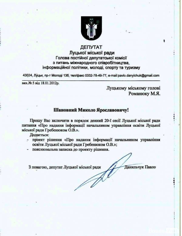 «У зв’язку із цим, з метою вирішення питання недофінансування галузі освіти та зняття соціальної напруги в місті, фракція партії «Фронт Змін» вимагає заслухати на черговому пленарному засіданні Луцької міської ради інформацію начальника управління освіти Олега Гребенюка з приводу проведення заходів з оптимізації освітянських закладів міста в розрізі виконання бюджету на 2012 рік», - розповіли у міській організації партії.