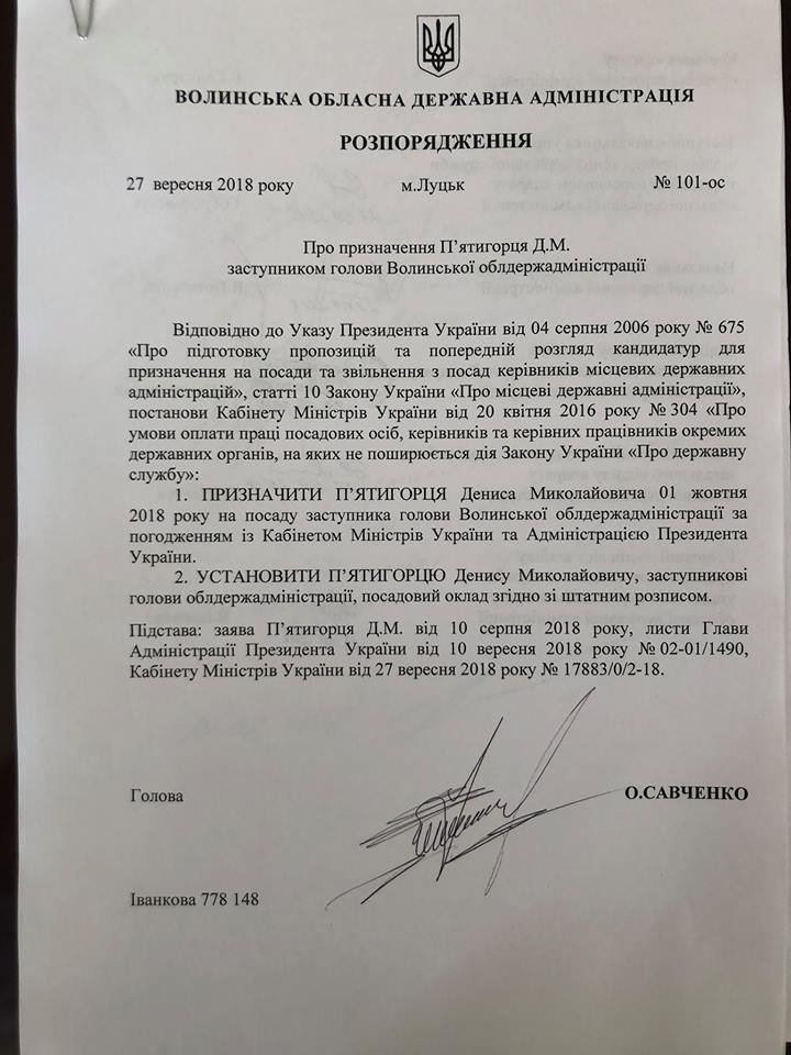 Згідно з документом, до виконання обов'язків заступника голови ОДА Денис П'ятигорець приступив сьогодні, 1 жовтня.