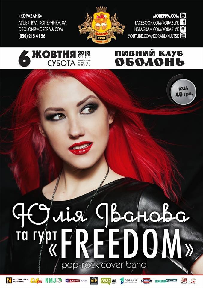 Подія: Юлія Іванова та гурт «FREEDOM» (Луцьк). Pop-rock cover band