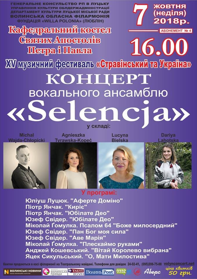 Що обіцяють: Ще одна фестивальна традиція – проведення т. зв. “Польських днів” – концертів за участі музикантів і співаків із сусідньої Польщі. Такі імпрези відбуваються за сприяння Генерального консульства Республіки Польща у Луцьку. Цьогоріч любителів музики чекає зустріч із вокальним ансамблем “Selencja” у складі Міхала Вайди-Хлопіцького, Агнєшки Туравської-Копець, Люцини Бєльської та Дарії Лягоцької. У програмі – акапельні твори Юліуша Луцюка, Піотра Янчака, Юзефа Свідера, Міколая Ґомулки, Анджея Кошевського, Яцека Сикульського.