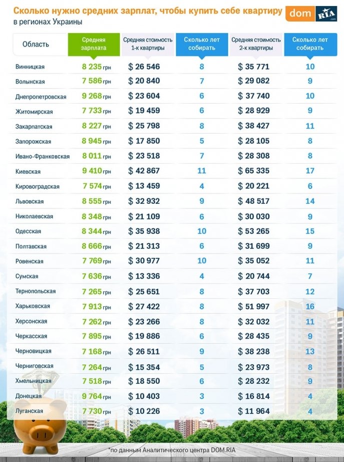В результаті, найбільш неблагополучним регіоном, незважаючи на один з найвищих рівнів зарплат, виявилася Київська область. Місцеві жителі будуть збирати на «однушку» 11 років. Одеситів і жителів Рівненської області для цього знадобитися працювати 10 років. Швидше вийде назбирати на квартиру в таких областях, як Кіровоградська - 4 роки, Чернігівська - 5 років і Запорізька - 5 років. У Києві на однокімнатну квартиру не на околиці міста доведеться збирати 8 років. На двокімнатне житло потрібно витратити 12 років.
