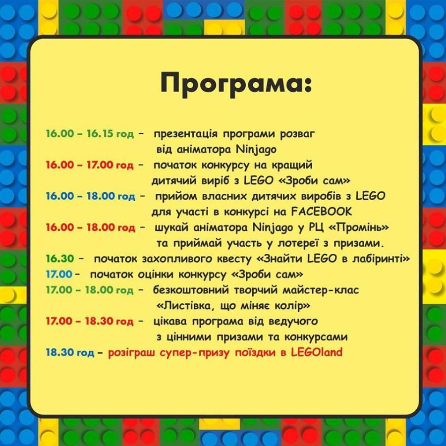 Це відбудеться з нагоди фіналу розіграшу путівки у LEGOLAND від РЦ «Промінь», «Смугастого носорога» та Туристичного агентства «Море турів».