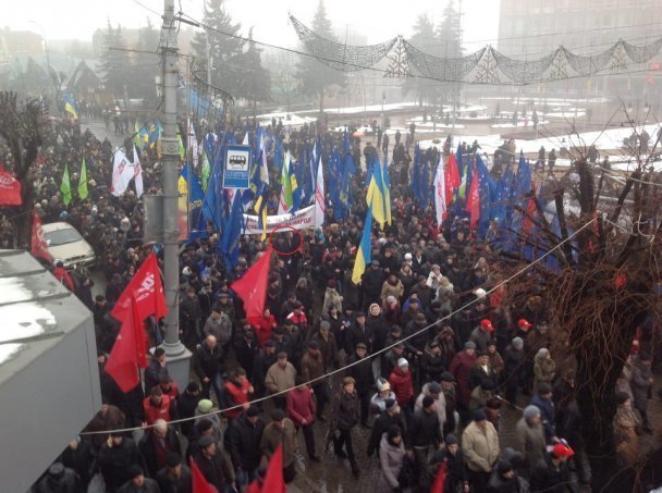 Проходячи центральною вулицею міста, рух транспорту на якій зараз перекритий, учасники акції сканують «Банду геть!» Вони також несуть плакати з написами «Народ прокинься!», «За Україну, за її долю, за честь і волю, за народ!» та інші.
