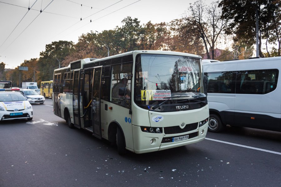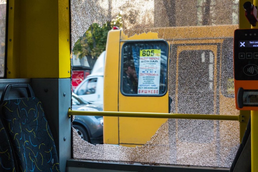 Маршрутка №401 врізалася в тролейбус №40. Тролейбус готувався повертати вправо на Солом’янську вулицю. Маршрутка при перестроюванні не розрахувала дистанцію і зачепила дзеркалом вікна тролейбуса. В результаті зіткнення скла розбилися і висипалися в салон транспорту.