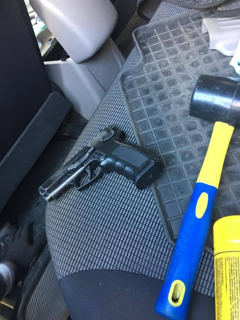 Наразі ж правоохоронці здійснили обшук у цій автівці та вилучили. Окрім того, вилучили та відправили на експертизу пістолет і гумовий молоток, які були застосовані під час нападу.