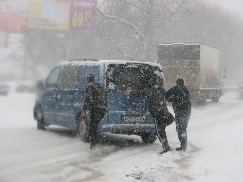 Західні області України страждають від сильних снігопадів: пасажири змушені штовхати маршрутки, дороги заметає, тролейбусні лінії обледеніють.