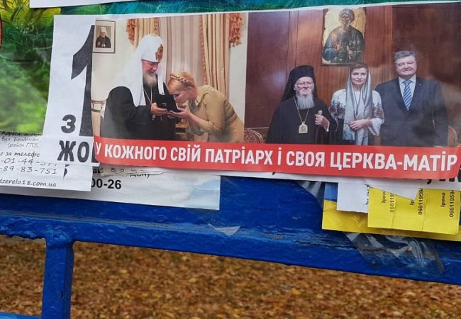 На них – зображення із двох частин. На одній – Юлія Тимошенко цілує руку главі Російської православної церкви Кирилові. На іншій – Президент України Петро Порошенко та його дружина разом з Вселенським патріархом Варфоломієм.