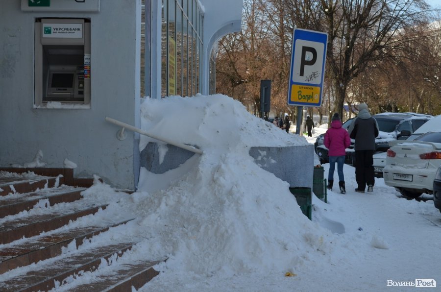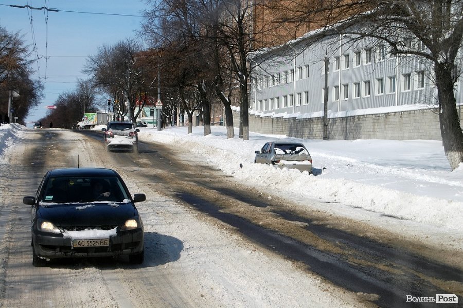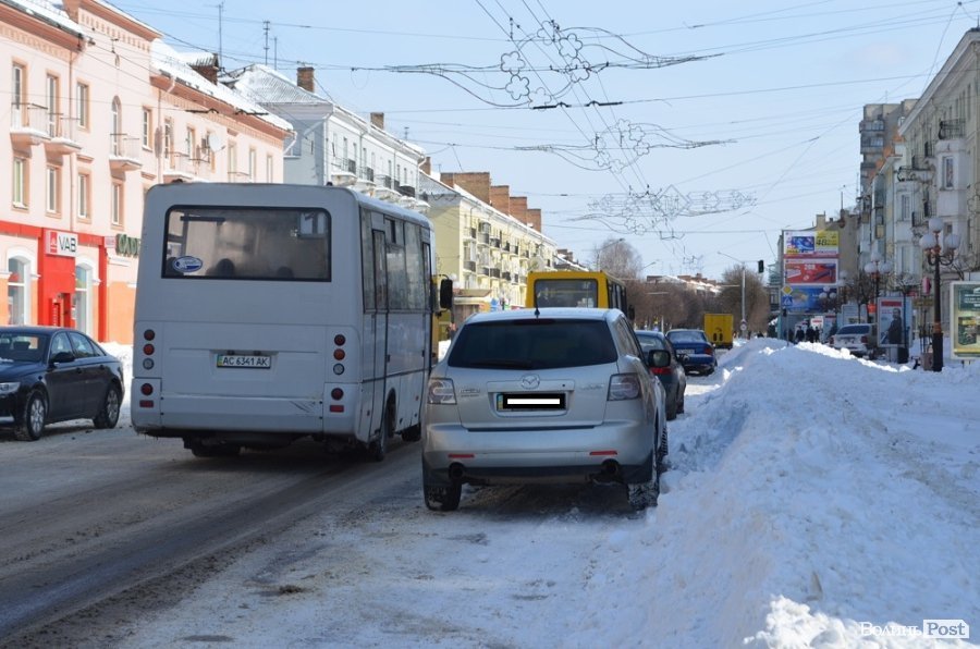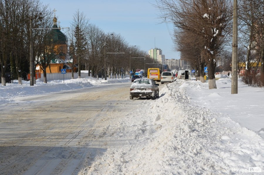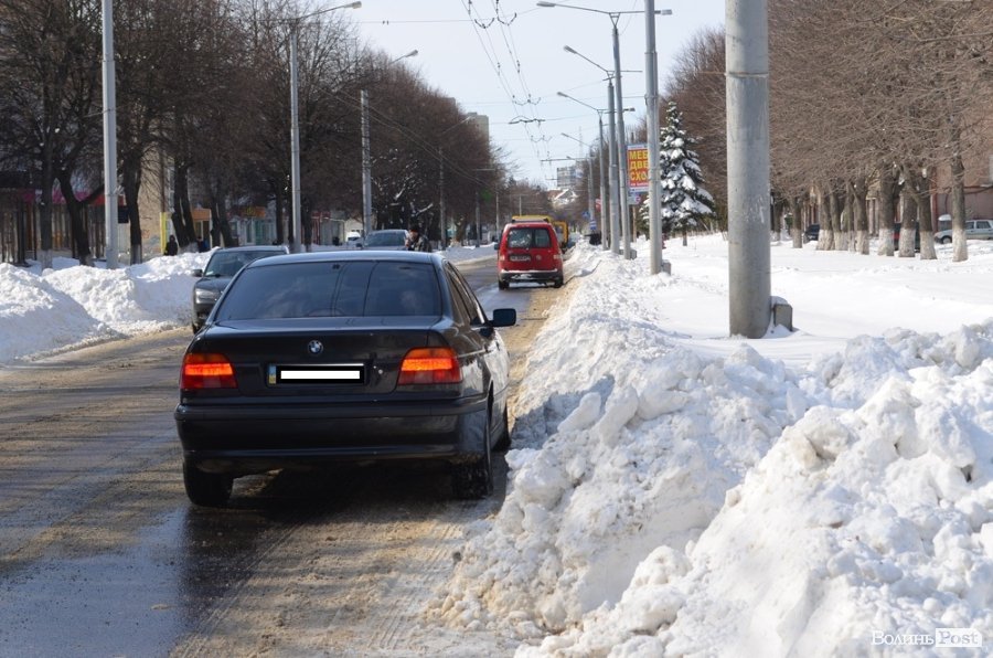 Як і під час грудневого снігопаду узбіччя луцьких доріг завалені снігом. Тому припарковані авто фактично лишають для інших транспортних засобів лише одну смугу для руху.
