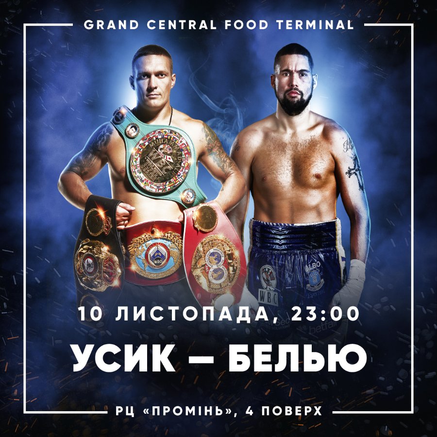У Grand Central, що знаходиться на 4-му поверсі розважального центру «Промінь», відбудеться трансляція бою українського абсолютного чемпіона Олександра Усика проти Тоні Белью.