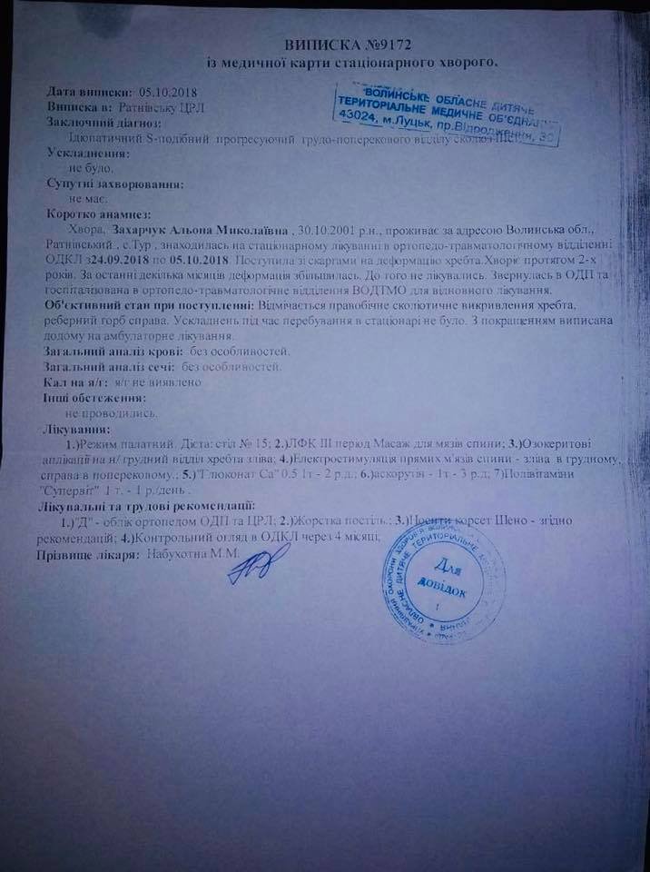 Під час звичайного профогляду в квітні цього року в сільській амбулаторії фельдшер звернув увагу, що хребет дівчинки надзвичайно швидко викривився. Через декілька місяців красуню Альону скрутило до сколіозу IV ступеню.