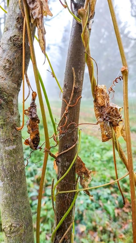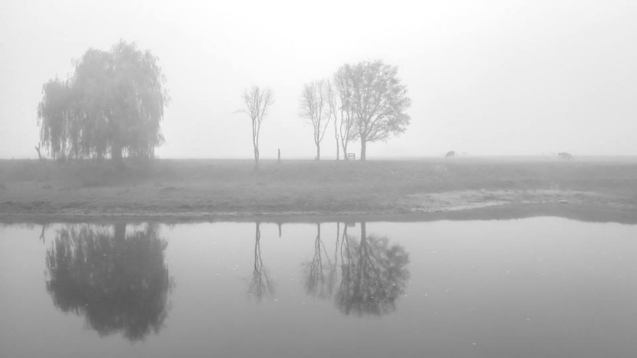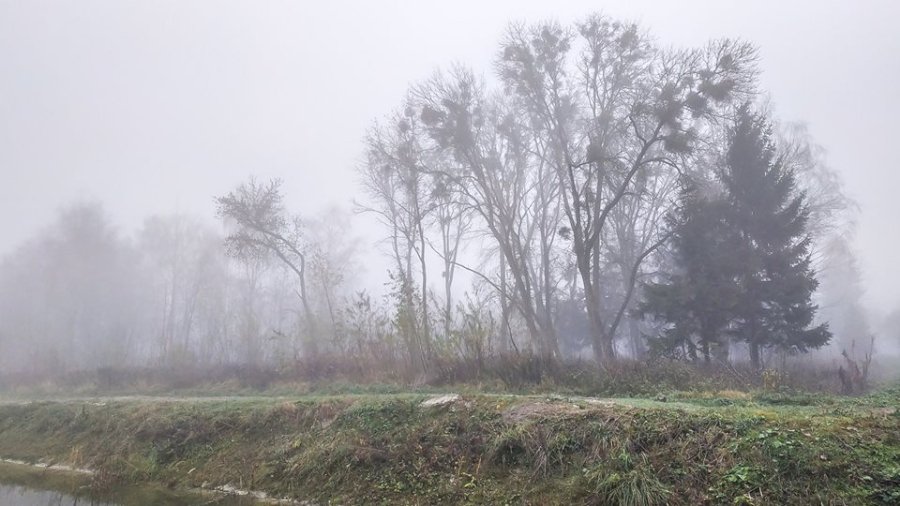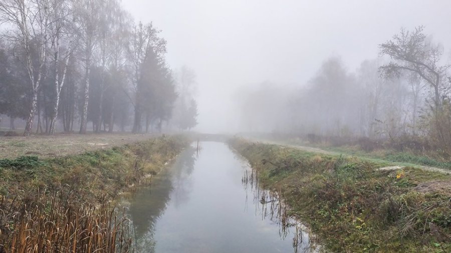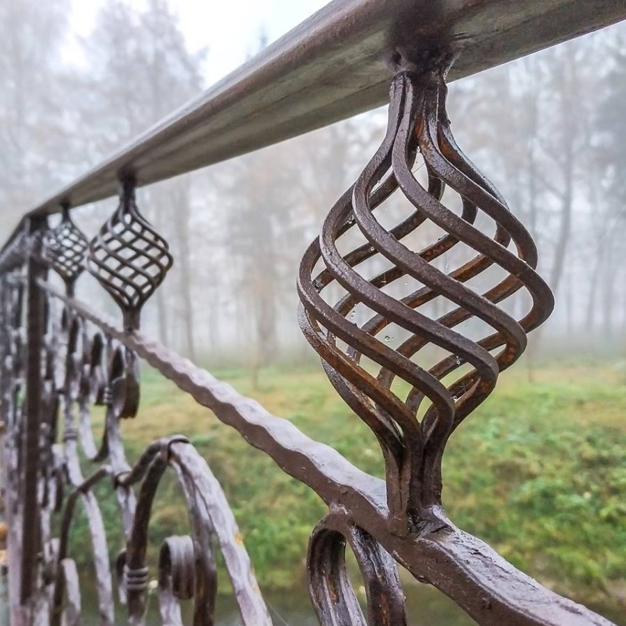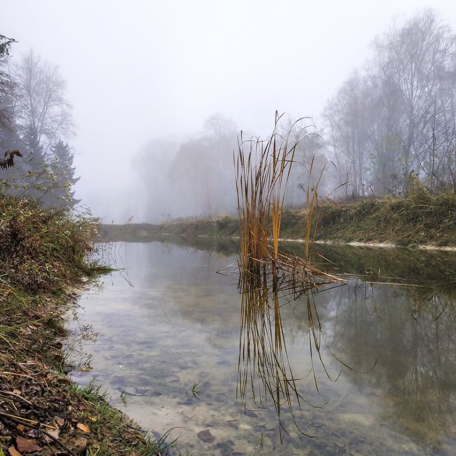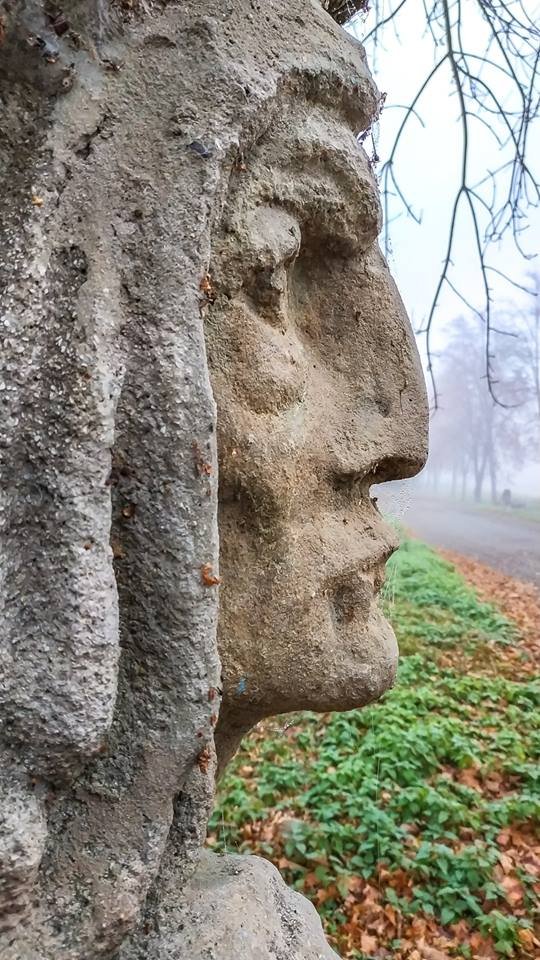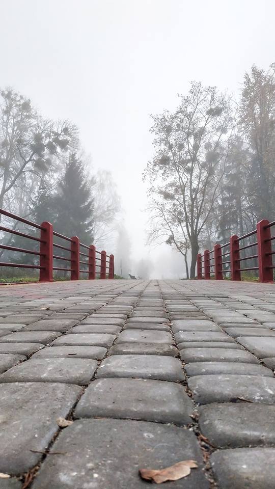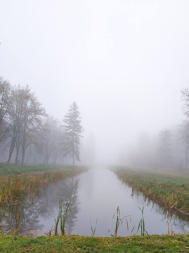 З-під білої пелени туману в об'єктив де-не-де зазирали кумедні кам'яні скульптури, поодинокі багряні листочки дерев та непохитна гладь води в каналах.