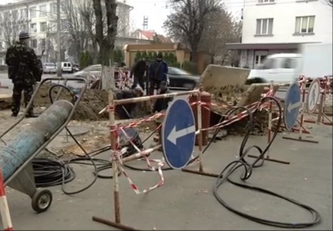 «Дорогу ми не риємо, там труба в гільзі. Гільза – діаметром 500 міліметрів. Тут дуже багато комунікацій: є газ, є кабель силовий і кабель освітлення іде. Будемо старатися під ними протягувати труби і протягувати на ту сторону, на ту камеру, що на Перемоги, 3. І так будемо з'єднуватись.