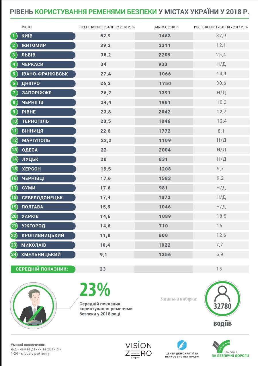 “У порівнянні з показниками такого ж дослідження минулого року, кількість водіїв, що пристібаються, зросла більш ніж на половину з 15 до 23%, що, на нашу думку, є досить позитивною динамікою. Як і минулого року, лідирує у рейтингу Київ, де понад 50% водіїв пристібаються. Втім, наближаються до столичних показників цього року також Житомир, Черкаси та Львів,” – зазначив керівник дослідження та співзасновник ГО “Vision Zero” Віктор Загреба.