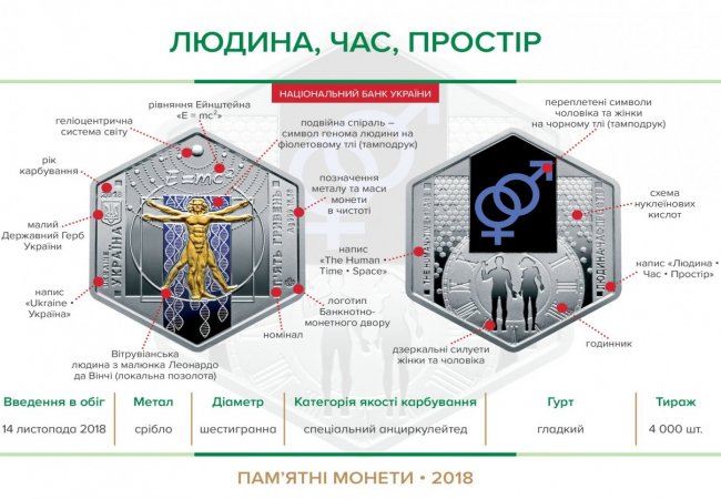 «Загалом цей набір присвячений науці, кожна монета з нього має свій унікальний сюжет. Монети мають шестигранну форму, вони оздоблені тамподруком (кольоровий друк) та локальною позолотою (на кожній монеті вміст золота не менше ніж 0,0001 г)», - пояснюють в повідомленні.