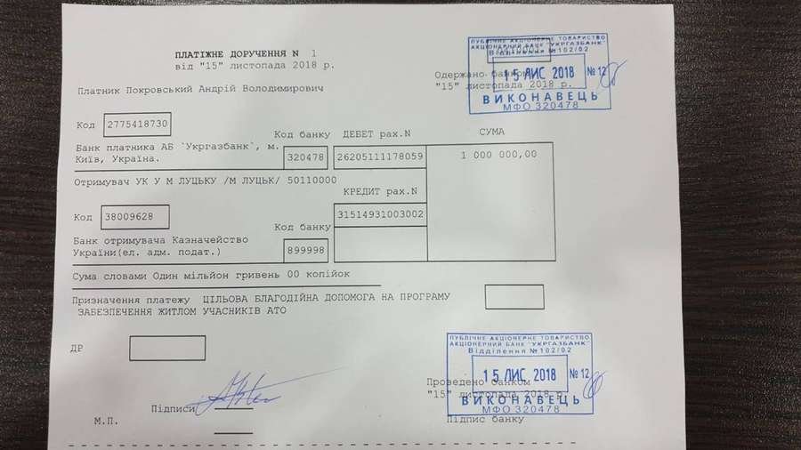 Депутат Луцькради Андрій Покровський, як і обціяв, переррахував мільйон гривень власних коштів на співфінансування Програми купівлі житла учасникам АТО.