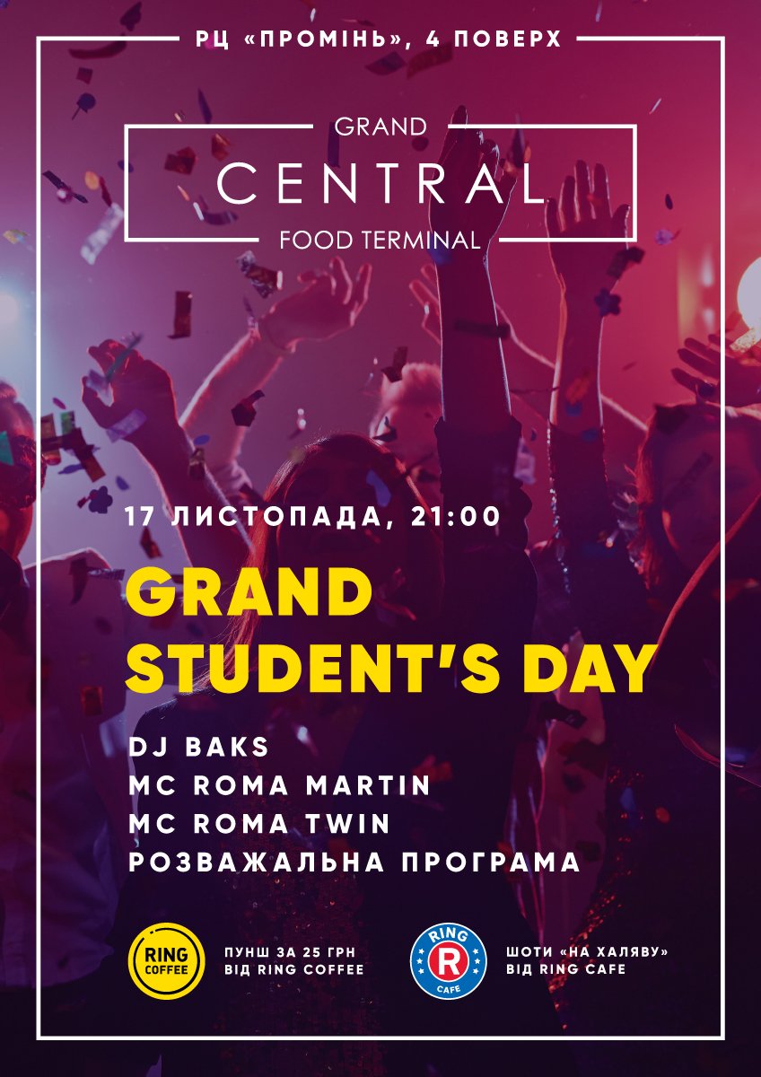 17 листопада о 21:00 у Grand Central food terminal, що на 4-му поверсі розважального центру «Промінь» розпочнеться вечірка «Grand Student’s Day».