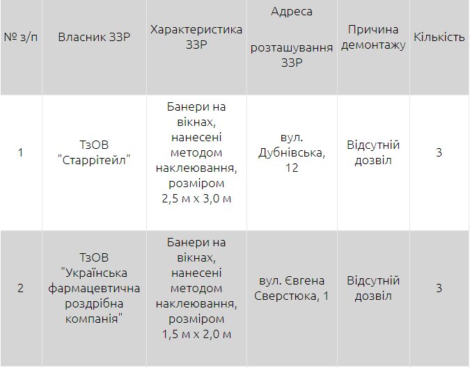 Перелік засобів зовнішньої реклами, що підлягають демонтажу