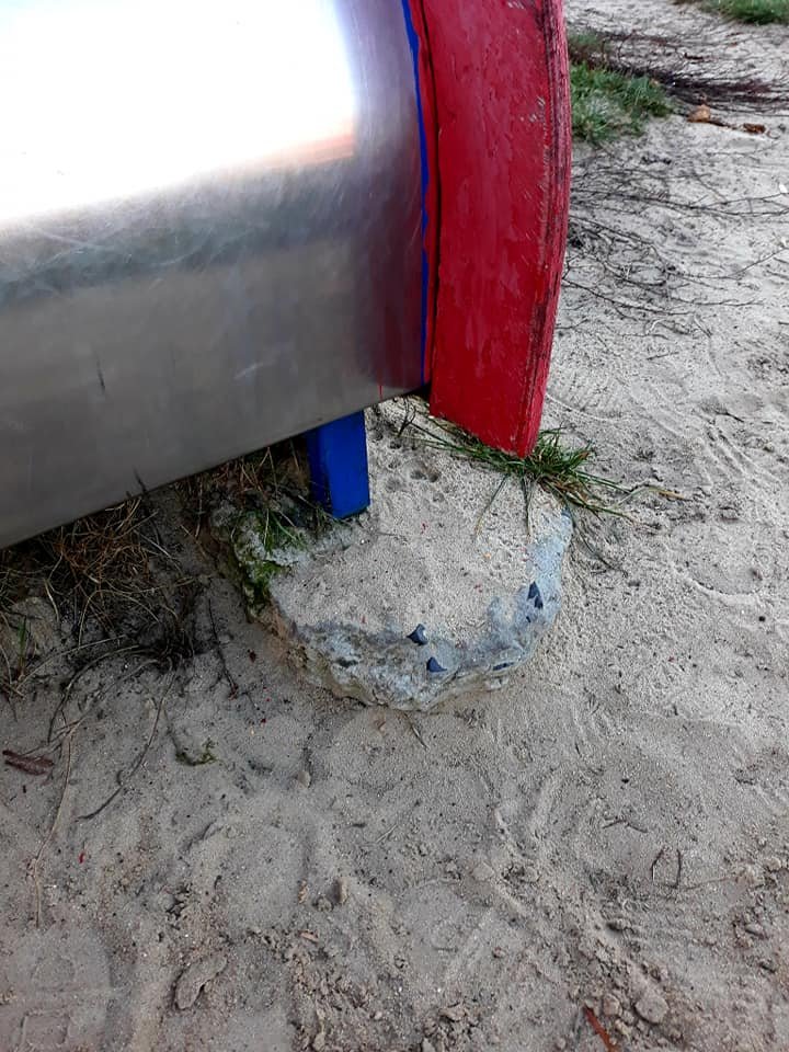 На дитячому майданчику у Любешеві стоїть гірка, з-під якої стирчить велизечне каміння.