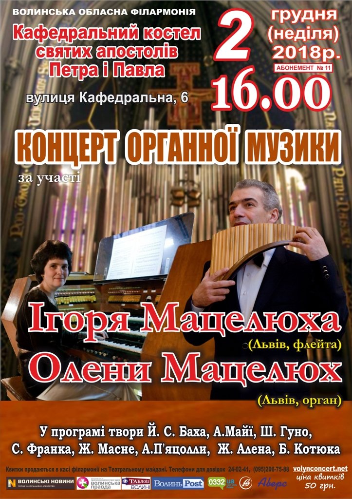 "На порозі ‒ грудень, і для любителів музики він теж обіцяє бути “концертним”. У травні цього року прихильники органної музики мали нагоду слухати виступ відомої майстрині цієї справи, львів’янки Олени Мацелюх", - повідомили у прес-службі Волинській обласній філармонії.