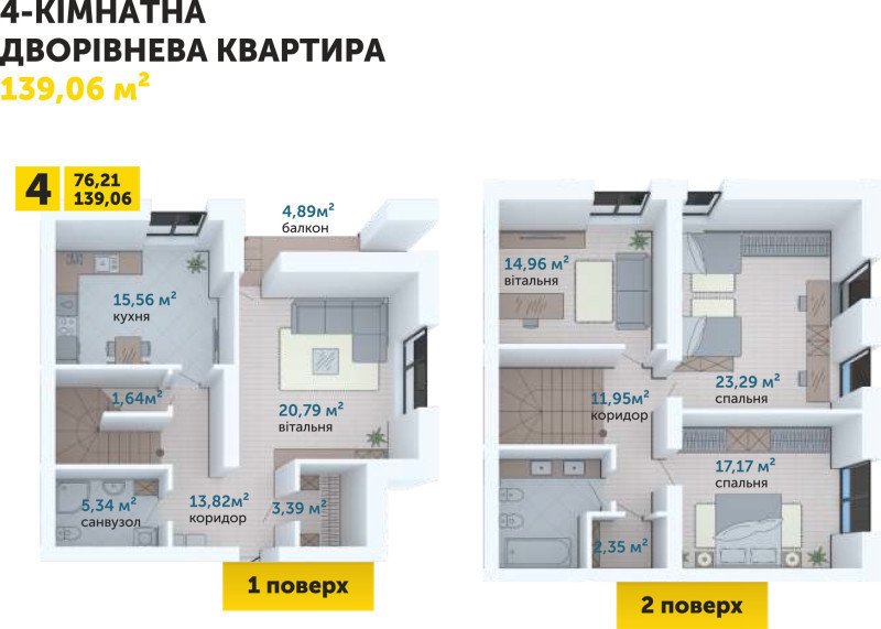 Два рівні – це можливість розмежовувати простори: відпочинок/розваги, батьки/діти, гості/сім’я… У квартирах – два санвузли. Величезна кухня. 4 кімнати. Окремий вихід на вулицю. Кладове приміщення. Гардеробна – розкіш, доступна далеко не у кожній навіть новій квартирі.