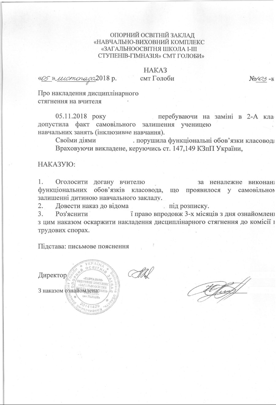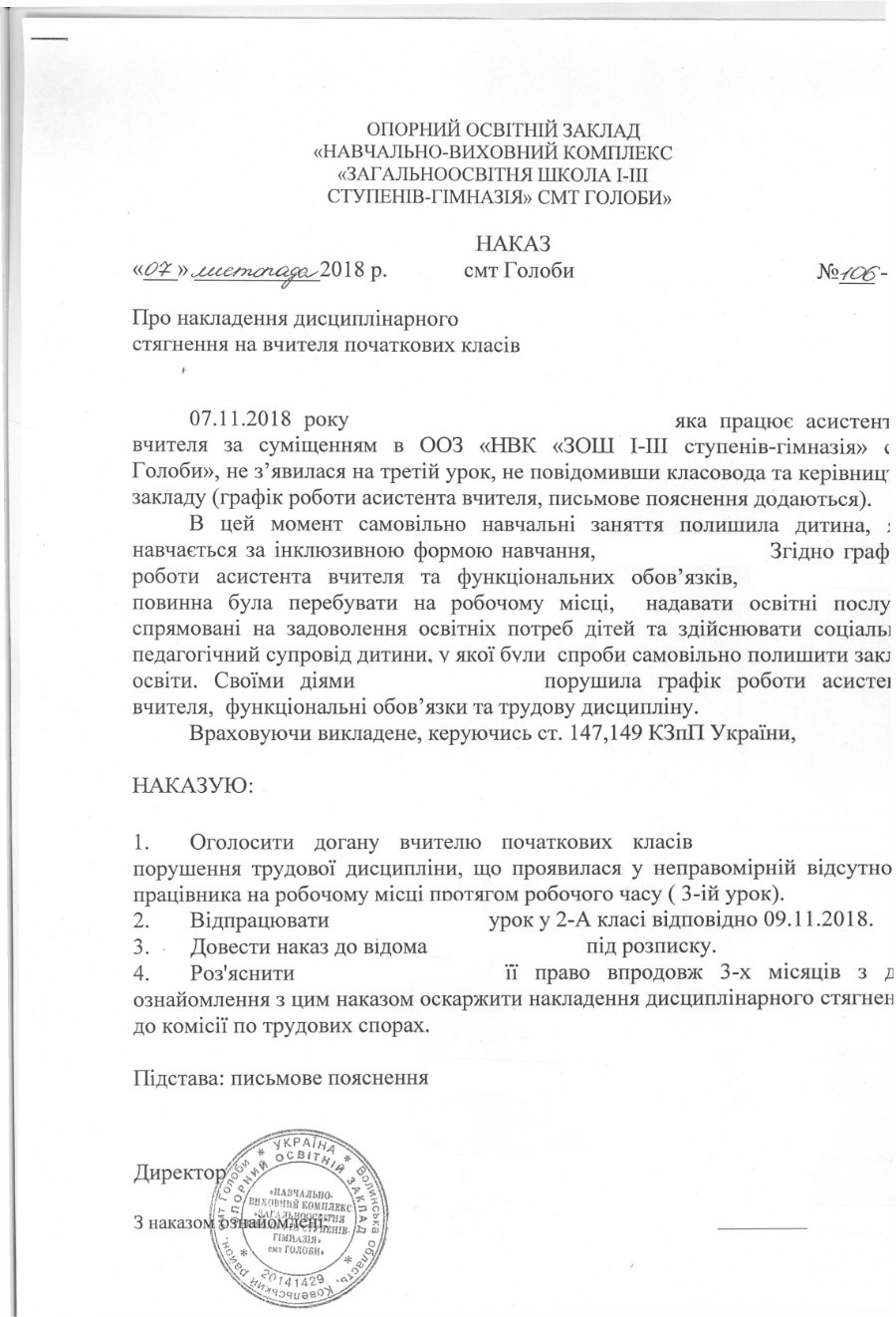 За цим фактом директор також наклала дисциплінарне стягнення (догану) уже на асистента. Вчитель погоджується, що була відсутня деякий час на уроці, проте з таким покаранням не погодилася, оскільки вважає, що воно є занадто суворим. Вона вважає, що, зважаючи на її професійні досягнення та роки педагогічної діяльності, керівництво могло обмежитися і усним попередженням.