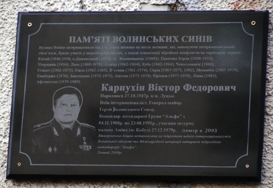 Ще у лютому 2009 року в Луцьку на вулиці Воїнів-інтернаціоналістів відкрили меморіальну дошку Карпухіну.