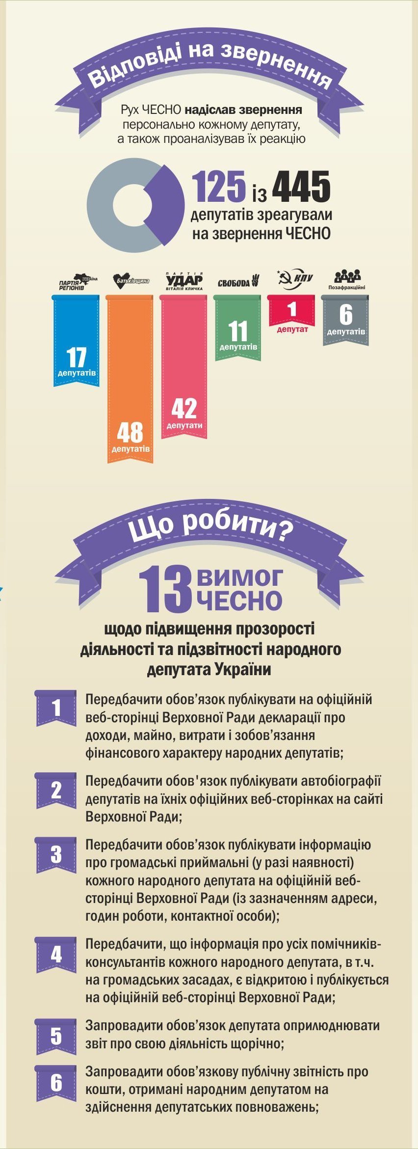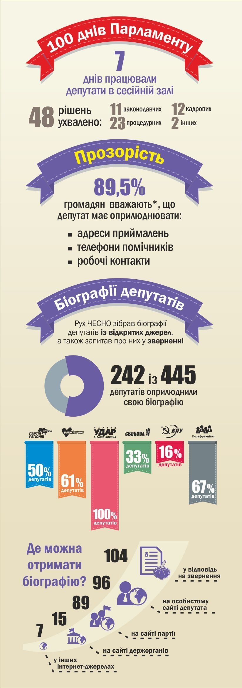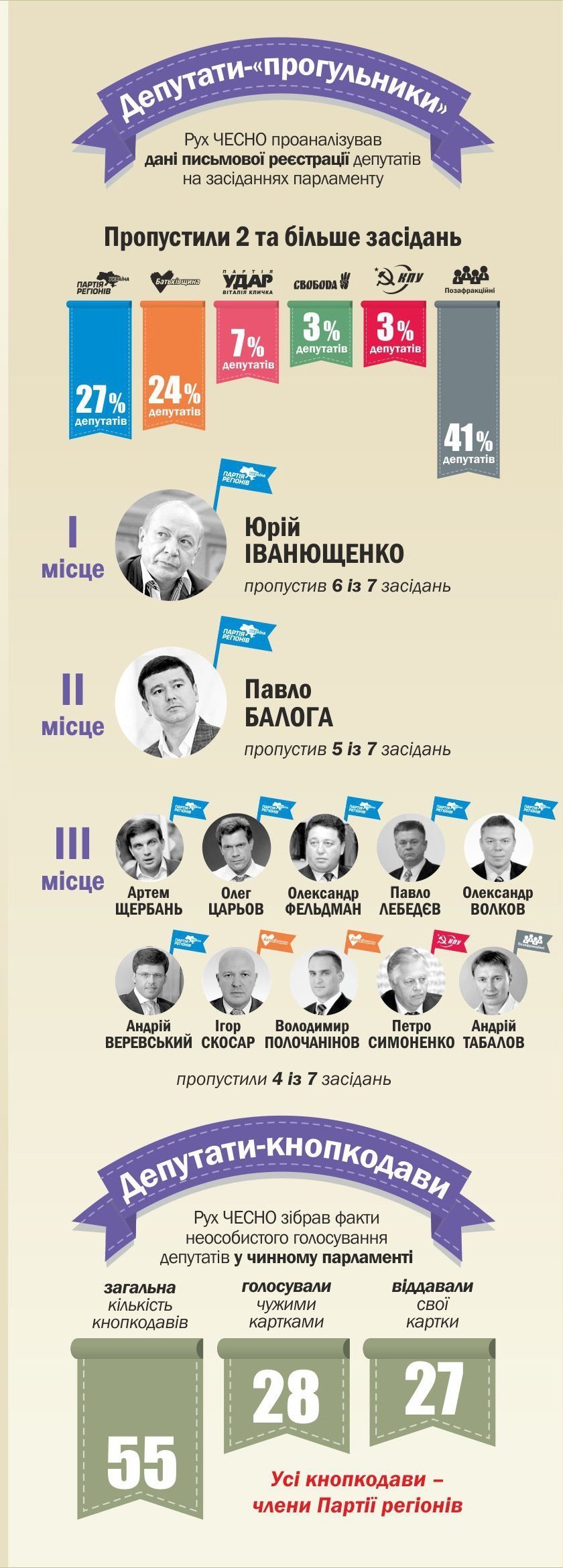 Серед них лише 25% депутатів від Партії регіонів, 44% від ‒ «Батьківщини», аж 95% ‒ від «Удару», 31% ‒ від «Свободи», 22% ‒ від КПУ та 50% позафракційних.