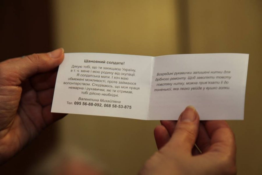 Про тактильні рукавички пані Валентини знає ледь не вся Україна. Жінка спочатку поставила за мету забезпечити теплими зручними виробами бодай роту, потім їй вдалось обігріти цілий батальйон, а тепер лік відправлених для захисників на Схід рукавичок сягнув вже понад 1000 пар. Вона туди ще й патріотичні листівочки вкладає, текст для яких диктувала сама. Коли хлопцям сказали, хто в’язав їм ті рукавиці, то багато хто з мужніх героїв розчулився до сліз.