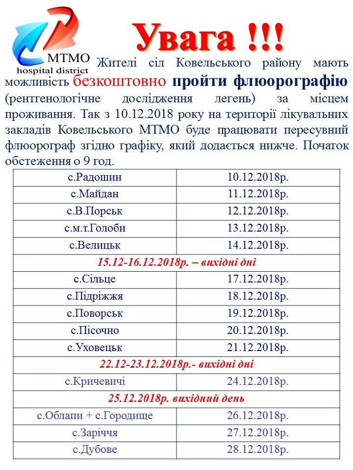 З 10 грудня у лікувальних закладах Ковельського МТМО прцюватиме пересувний флюорограф.