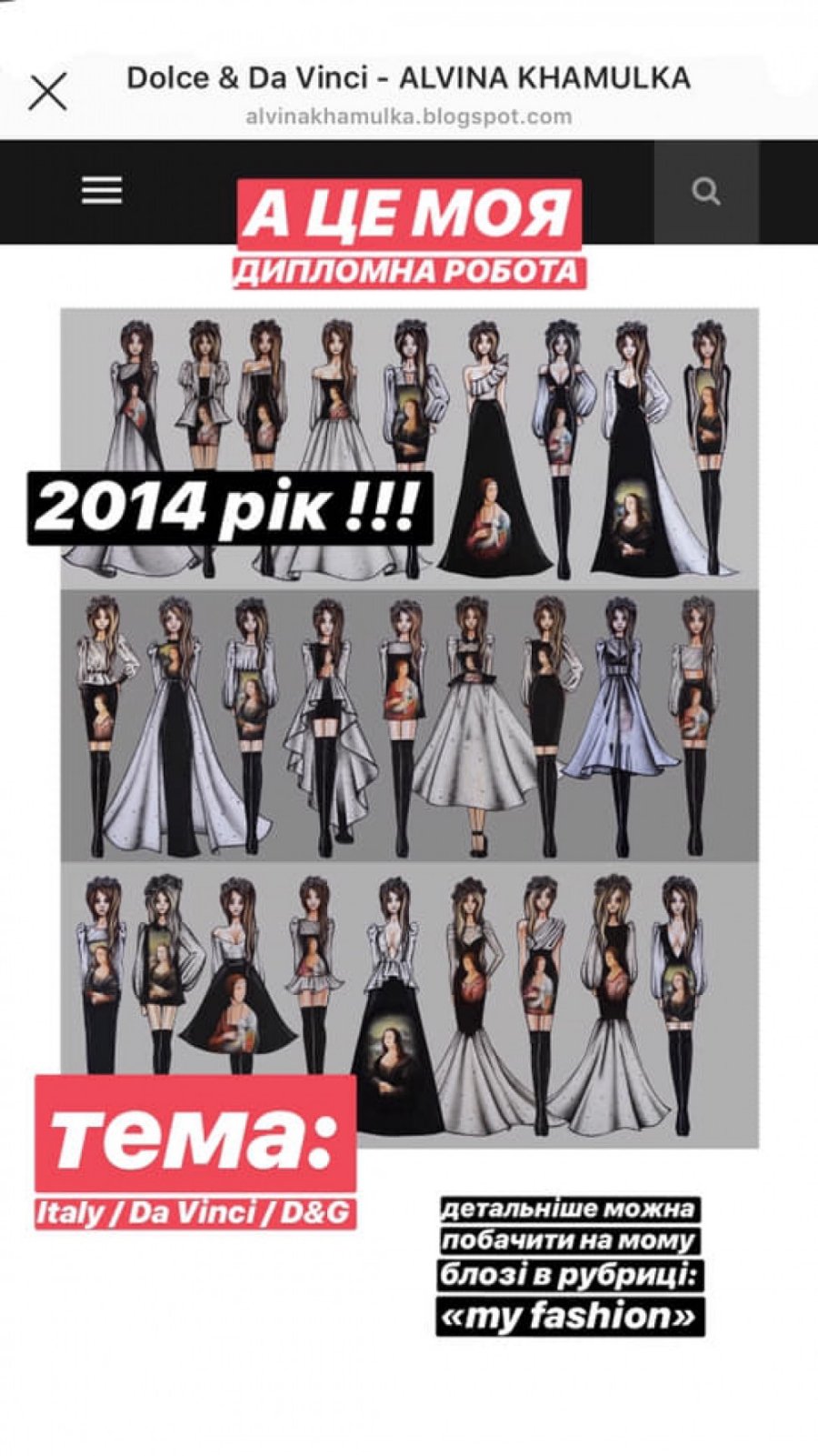 «Подивишись нову колекцію Dolce&Gabbana Alta MODA 2O18 в Мілані я була дуже здивована, що одна з моделей була дуже схожа на мою. Не сприйміть за високомірність, просто подивіться самі. Не знаю, наскільки можливий такий феноменальний збіг ідей, в кольоровій гамі, фасонах, та в цілому, з різницею 4х років?!» – дивується Альвіна.