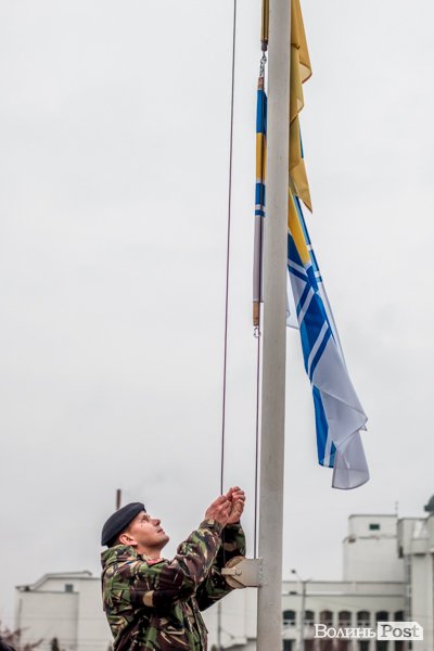Над будівлею Волинської облдержадміністрації підняли прапор Військово-Морських сил Збройних сил України. Стяг замайорів на підтримку моряків, захоплених російськими силовиками в Чорному морі 25 листопада.