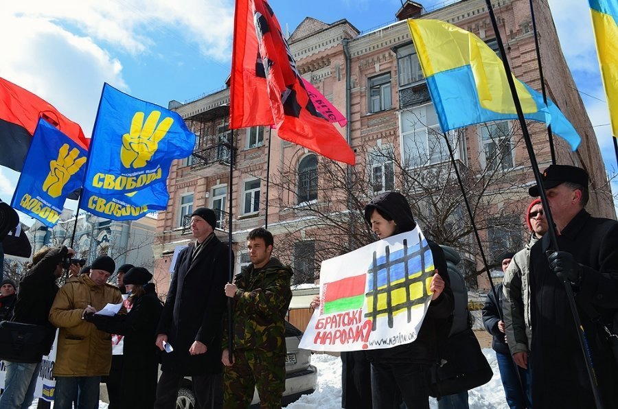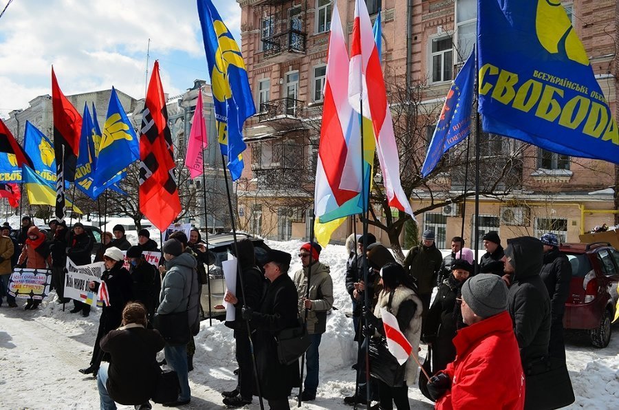 Близько п’ятдесяти активістів Національного Альянсу та членів інших громадських організацій 25 березня пікетували посольство Республіки Білорусь в Києві.